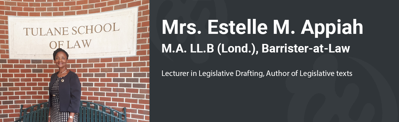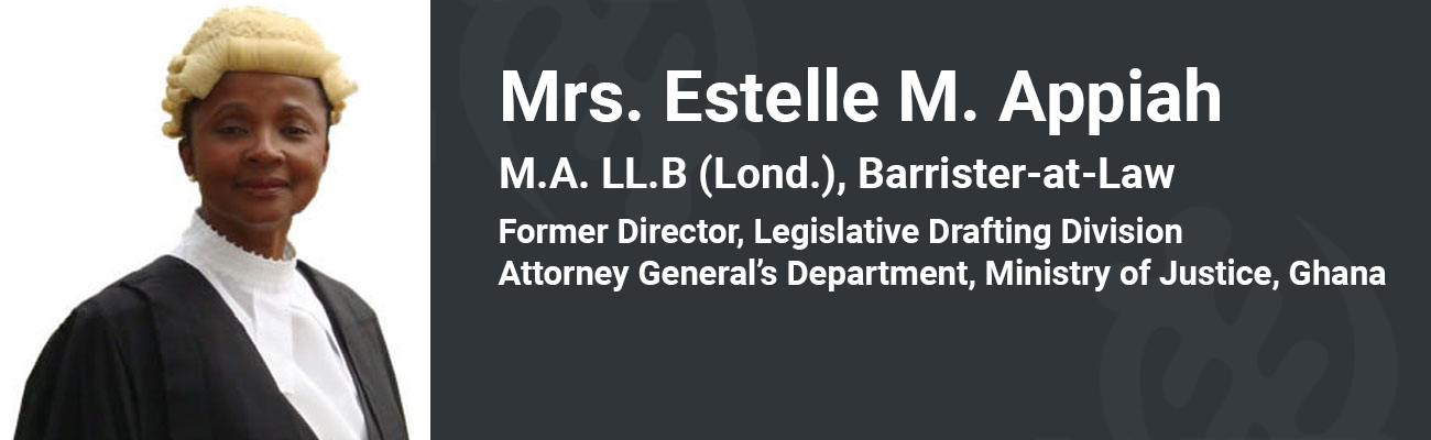 Estelle Appiah is an expert in legislative drafting with more than 30 years experience. She was formerly the Director of Legislative Drafting at the Attorney-General's Department of the Ministry of Justice in Ghana with the status of a Justice of the Court of Appeal.